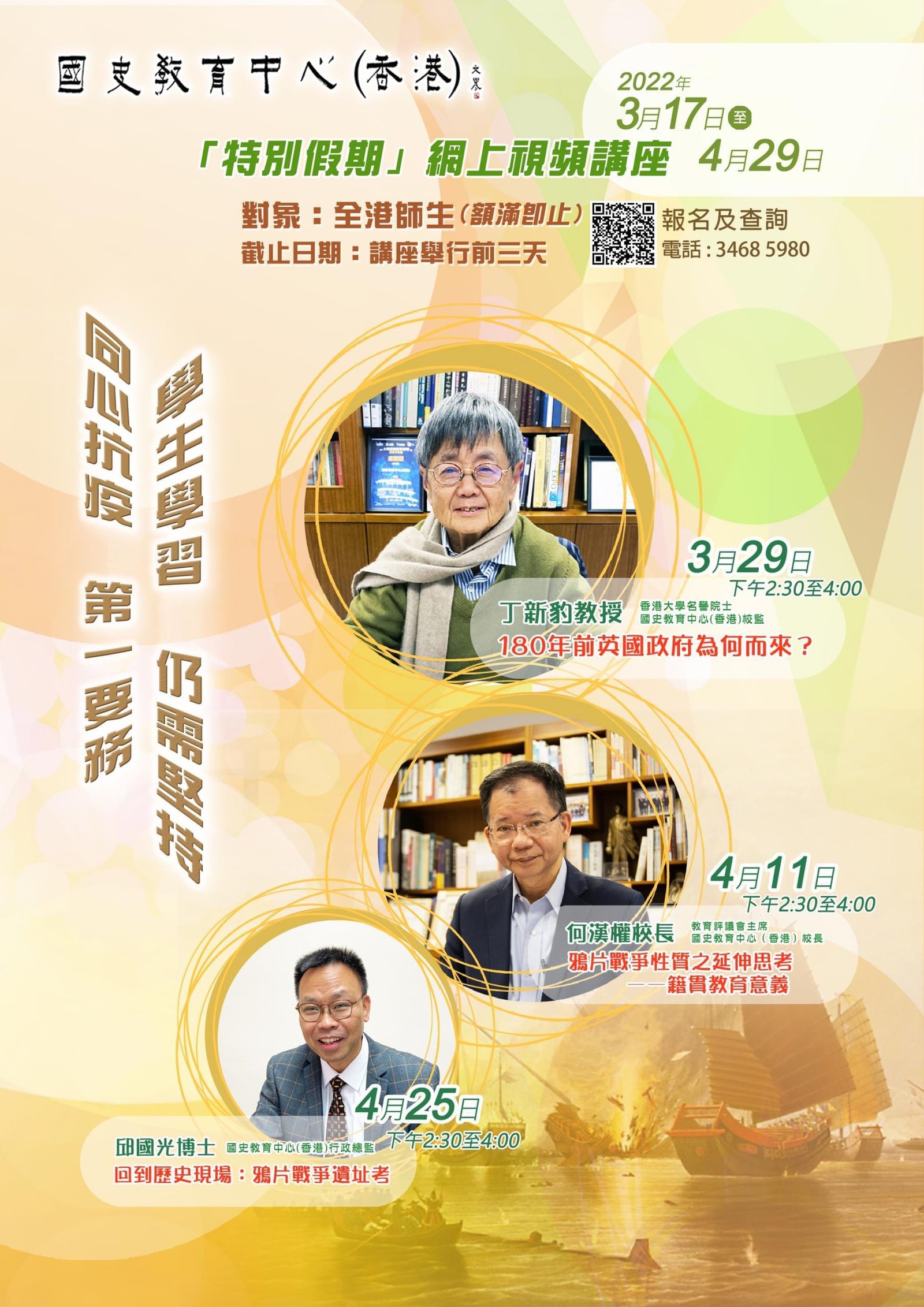 「特別假期」網上視頻講座「特別假期」網上視頻講座 同心抗疫,第一要務,學生學習,仍需堅持 國史教育中心(香港)在3月17日 – 4月29日特別假期期間,將舉行一系列圍繞鴉片戰爭相關歷史的網上視頻講座,期望同學在同心抗疫之餘,仍能堅持學習,過一個溫暖並有意義的特別假期!此講座亦歡迎老師、家長乃至一般公眾人士參與,請立即報名!報名方法**活動詳情將於講座舉行前一天透過電郵發送予 閣下,敬請留意!講座一講題:180年前英國政府為何而來? 講者:丁新豹教授 日期:2022年3月29日(二) 時間:14:30-16:00講座二講題:鴉片戰爭性質之延伸思考──籍貫教育意義 講者:何漢權校長 日期:2022年4月11日(一) 時間:14:30-16:00講座三講題:回到歷史現場──鴉片戰爭遺址考 講者:邱國光博士 日期:2022年4月25日(一) 時間:14:30-16:00同儕互助 DSE「疫境」摘星講座糸列同心抗疫,第一要務,學生學習,仍需堅持 國史教育中心(香港)青年委員,為今屆DSE同學舉辦疫境摘星講座糸列,其講座包括中文、通識、中史及歷史科目,同學在備戰之餘,也可透過這系列講座吸收過來人考試心得及各科作答竅門,作最後衝線,詳情如下:報名表格**活動詳情將於講座舉行前一天透過電郵發送予 閣下,敬請留意!中文科講者:周正賢 日期:2022年3月29日(二) 時間:16:30-18:00通識科講者:張瑋宗 日期:2022年4月5日(二) 時間:16:30-18:00中史科講者:張瑋宗 日期:2022年4月12日(二) 時間:16:30-18:00歷史科講者:李清雅 日期:2022年4月20日(三) 時間:14:30-16:00nationalhistory2022-04-25T09:16:11+08:00