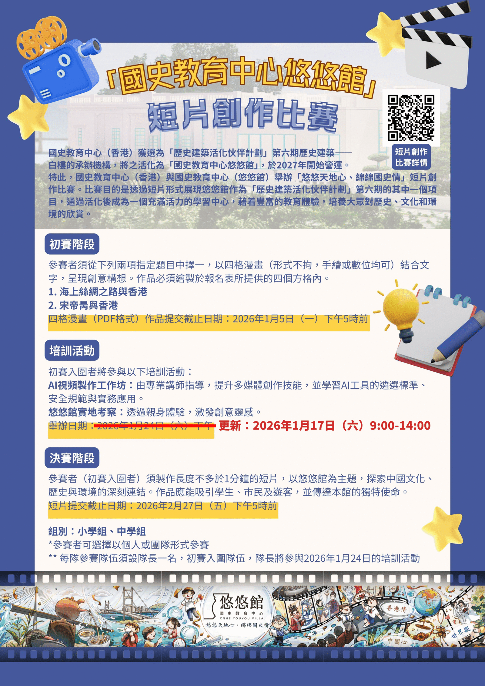 特此,國史教育中心(香港)與國史教育中心(悠悠館)舉辦「悠悠天地心、綿綿國史情」短片創作比賽。比賽目的是透過短片形式展現悠悠館作為「歷史建築活化伙伴計劃」第六期的其中一個項目,通過活化後成為一個充滿活力的學習中心,藉着豐富的教育體驗,培養大眾對歷史、文化和環境的欣賞。